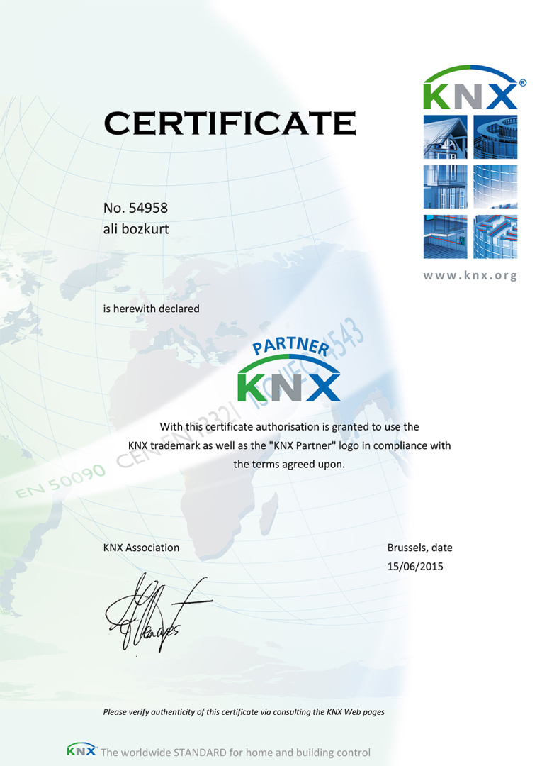 Ayrıca, Hager Electro GmbH tarafından verilen teknik yeterlilik sertifikamız ve KNX Association tarafından onaylanan “KNX Partner” yetkinliğimiz, bina otomasyonu ve akıllı sistem çözümlerinde ne kadar yetkin olduğumuzu göstermektedir.