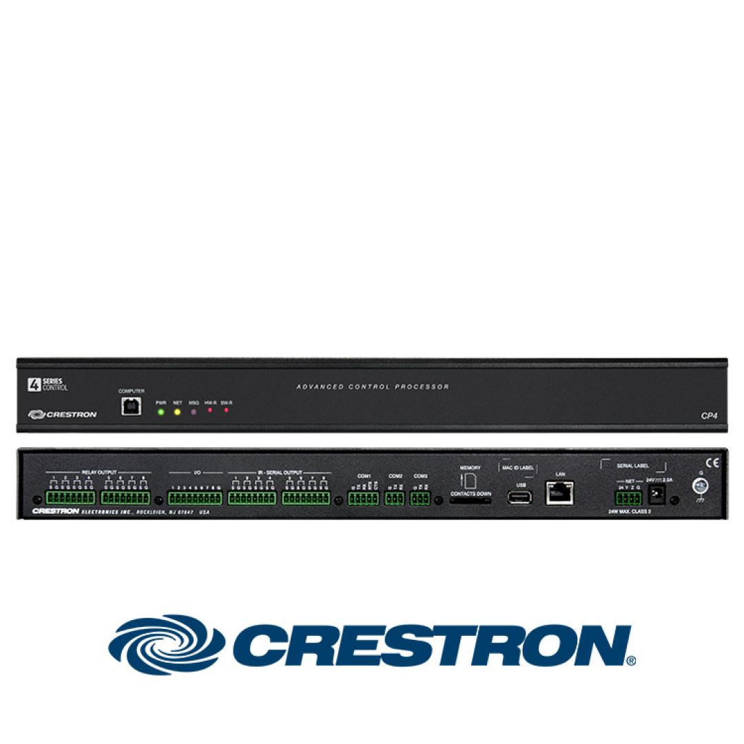 Crestron® CP4, modern akıllı ev/kurumsal/government projelerinde farklı sistemleri tek platformda birleştiren 4-Series™ kontrol işlemcisidir. Çok çekirdekli CPU’su ve 2 GB SDRAM / 8 GB flash belleğiyle gelişmiş otomasyonu rahatlıkla yönetir. Gigabit Ethernet, Cresnet®, 8× IR, 3× COM (RS-232/422/485), 8× röle ve 8× Versiport I/O ile geniş entegrasyon sunar. XiO Cloud® ile uzaktan hazırlama/yönetim, Crestron Fusion® ile oda izleme/planlama; BACnet ve SNMPv3 ile IT-dostu entegrasyon sağlar. Apple® HomeKit® eşleştirme desteği mevcuttur ve cihaz rack-mount kuruluma uygundur.